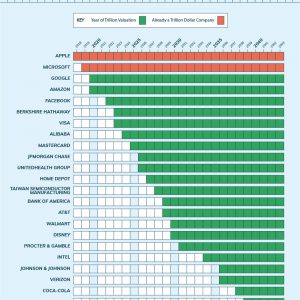 Google looks set to join their fellow tech giants Apple and Microsoft in hitting the $1 trillion mark within the next year (as will Amazon, who have hit the threshold in the past but have briefly dropped out again). The numbers suggest that they’ll soon be followed by the last of the Big Four tech companies, Facebook, whose market cap currently sits at around $665bn, but has seen an average growth of 24% over the last five years, which, if continued, could see them join the club in 2022. Next in line would be Warren Buffet’s Berkshire Hathway conglomerate and financial services provider Visa who could both hit $1 trillion valuations by 2023.